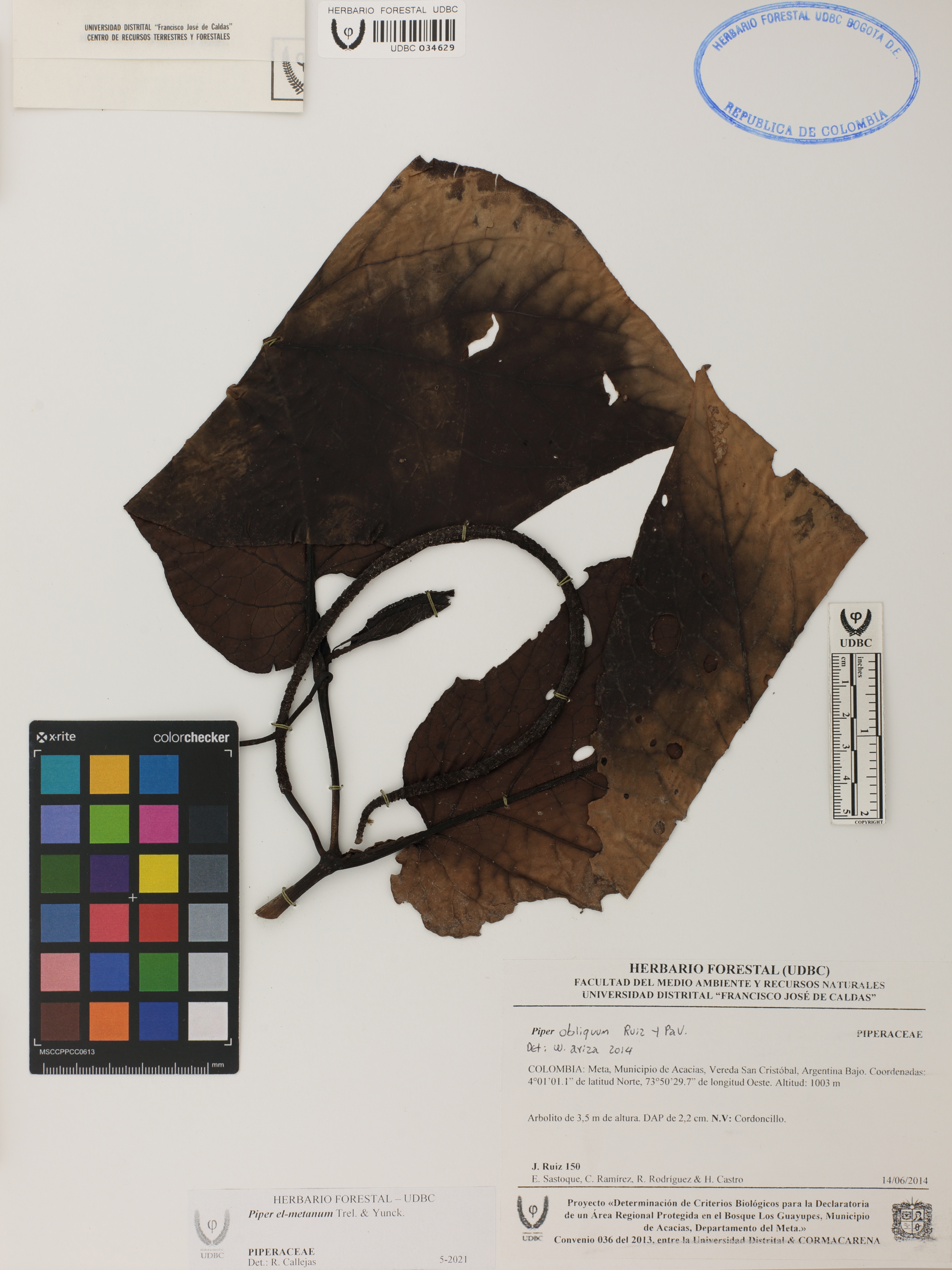Fotografía del ejemplar Ruiz, J. 150, determinado como Piper el-metanum en el año 2021