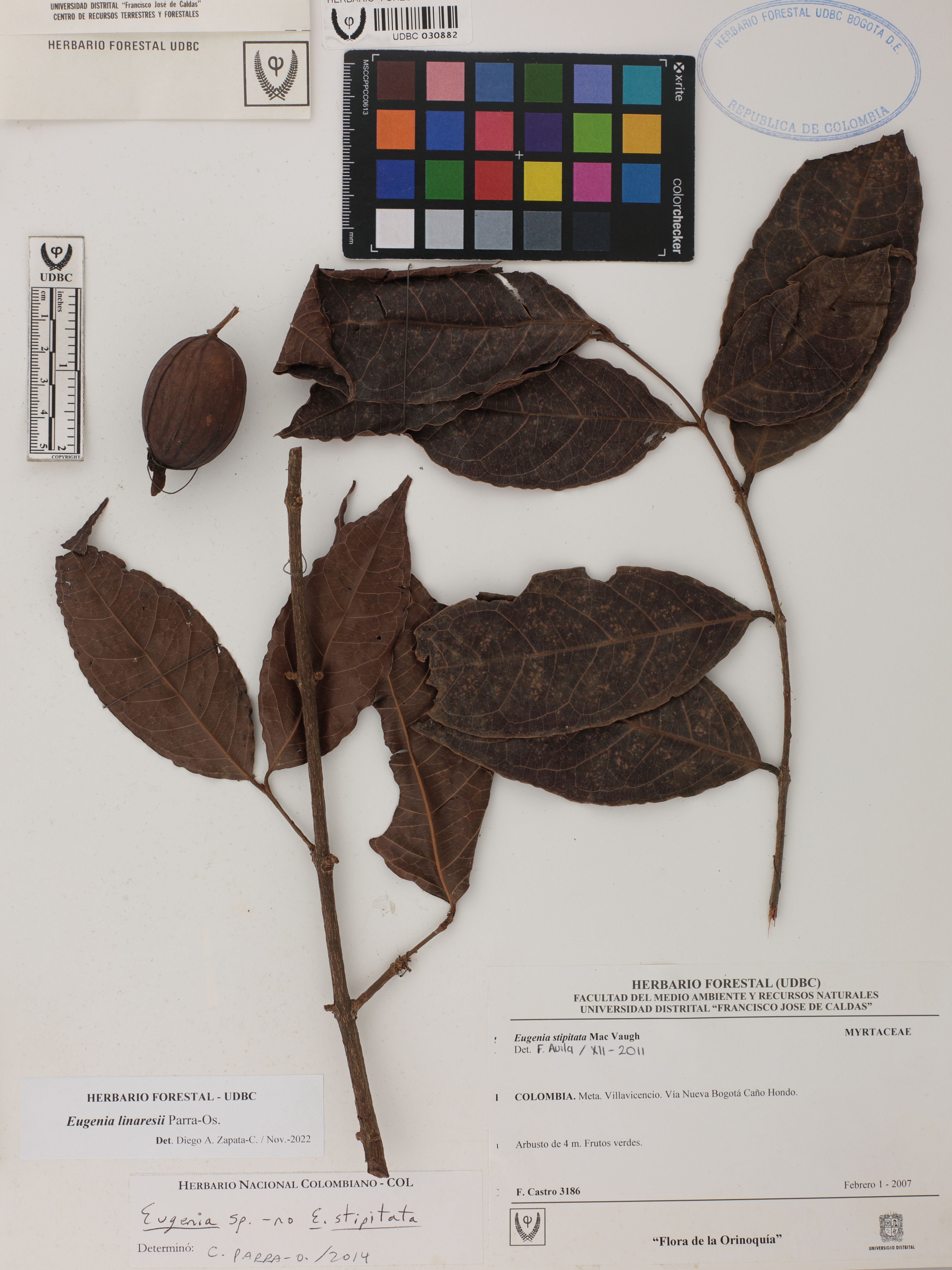 Fotografía del ejemplar Castro, F. 3186, determinado como Eugenia linaresii en el año 2022