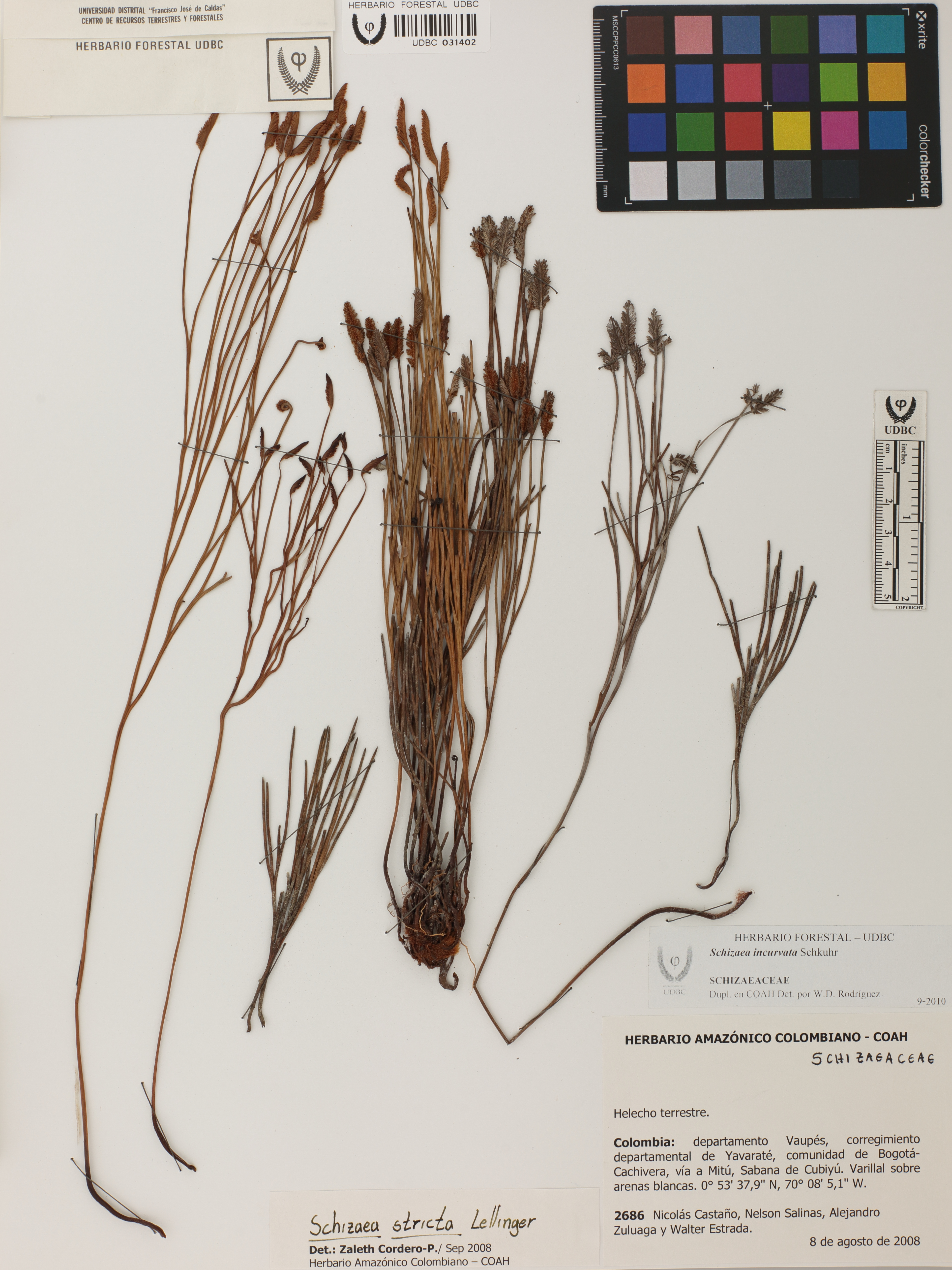 Fotografía del ejemplar Castaño, N. 2686, determinado como Schizaea incurvata en el año 2010