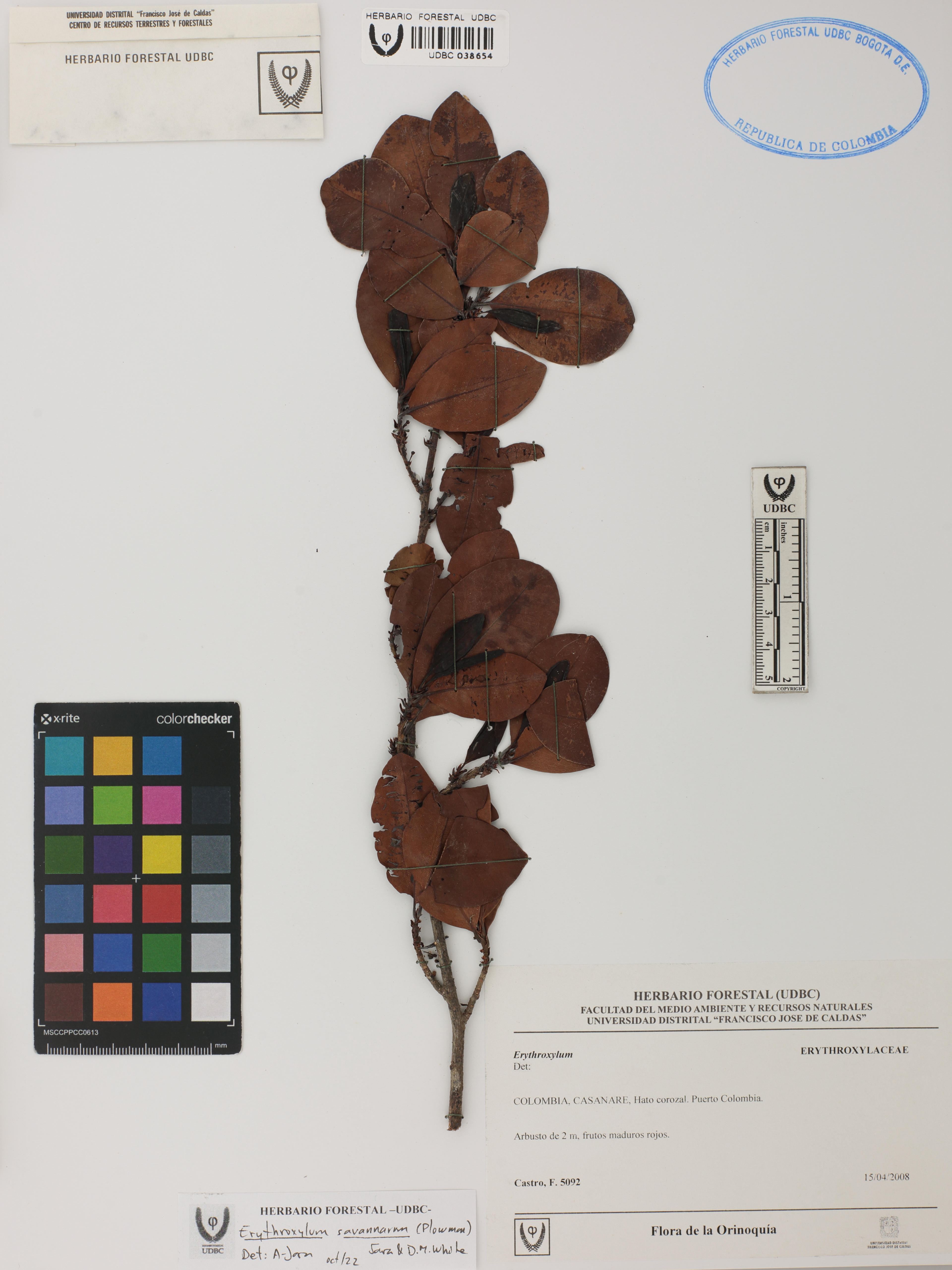 Fotografía del ejemplar Castro, F. 5092, determinado como Erythroxylum savannarum en el año 2022