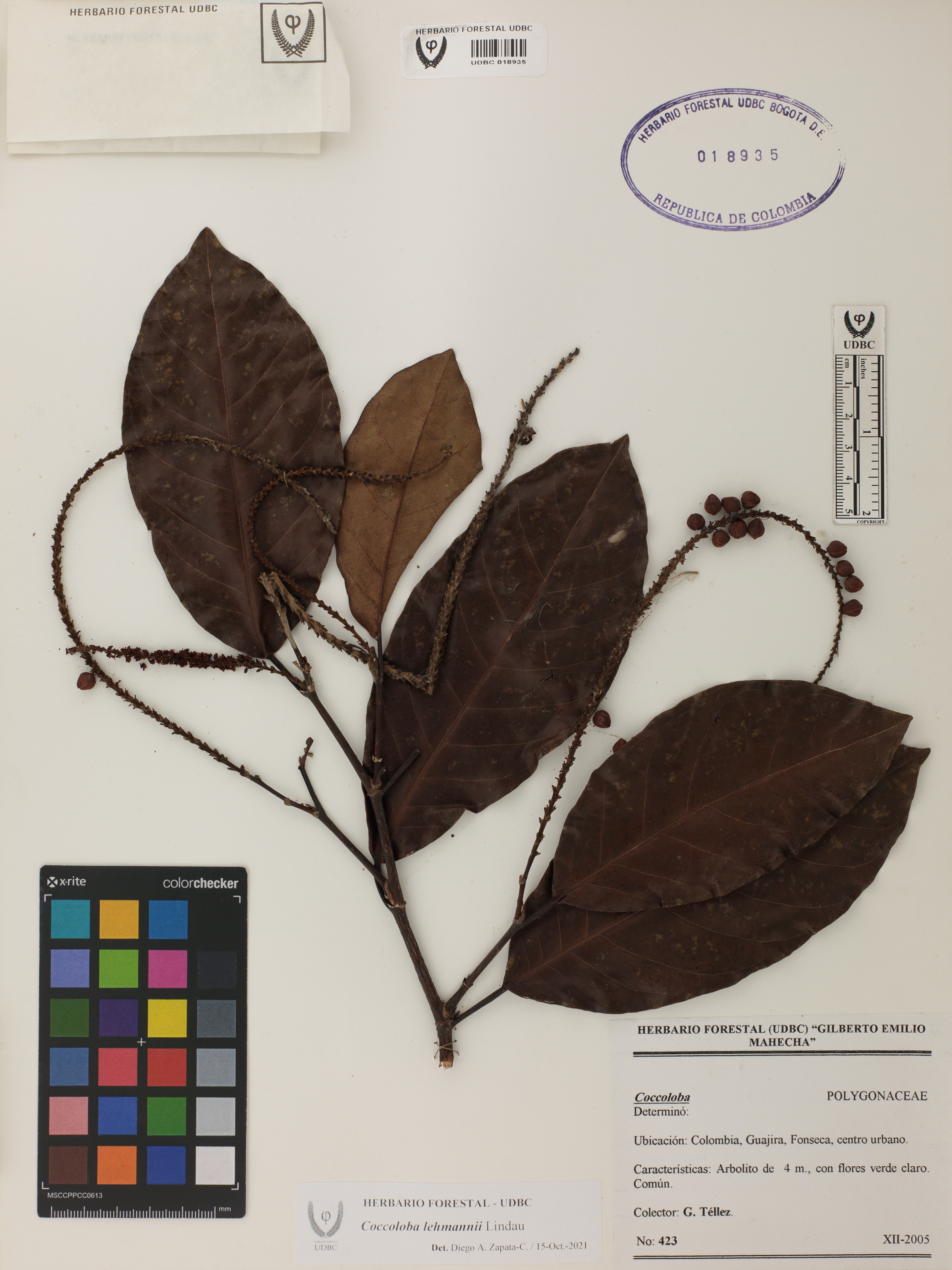 Fotografía del ejemplar Téllez, G. 423, determinado como Coccoloba lehmannii en el año 2021
