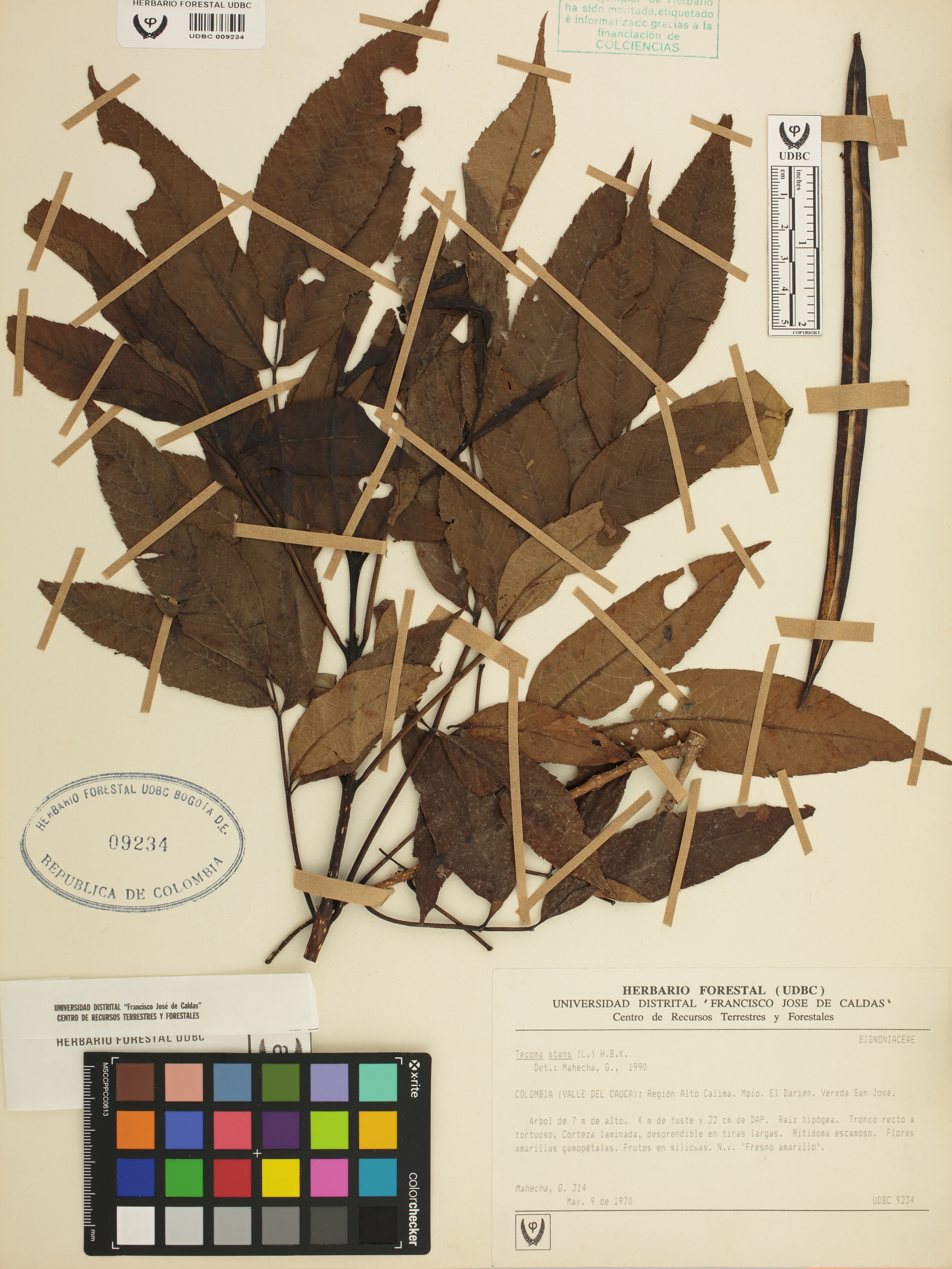 Fotografía del ejemplar Mahecha, G. 314, determinado como Tecoma stans en el año 1990