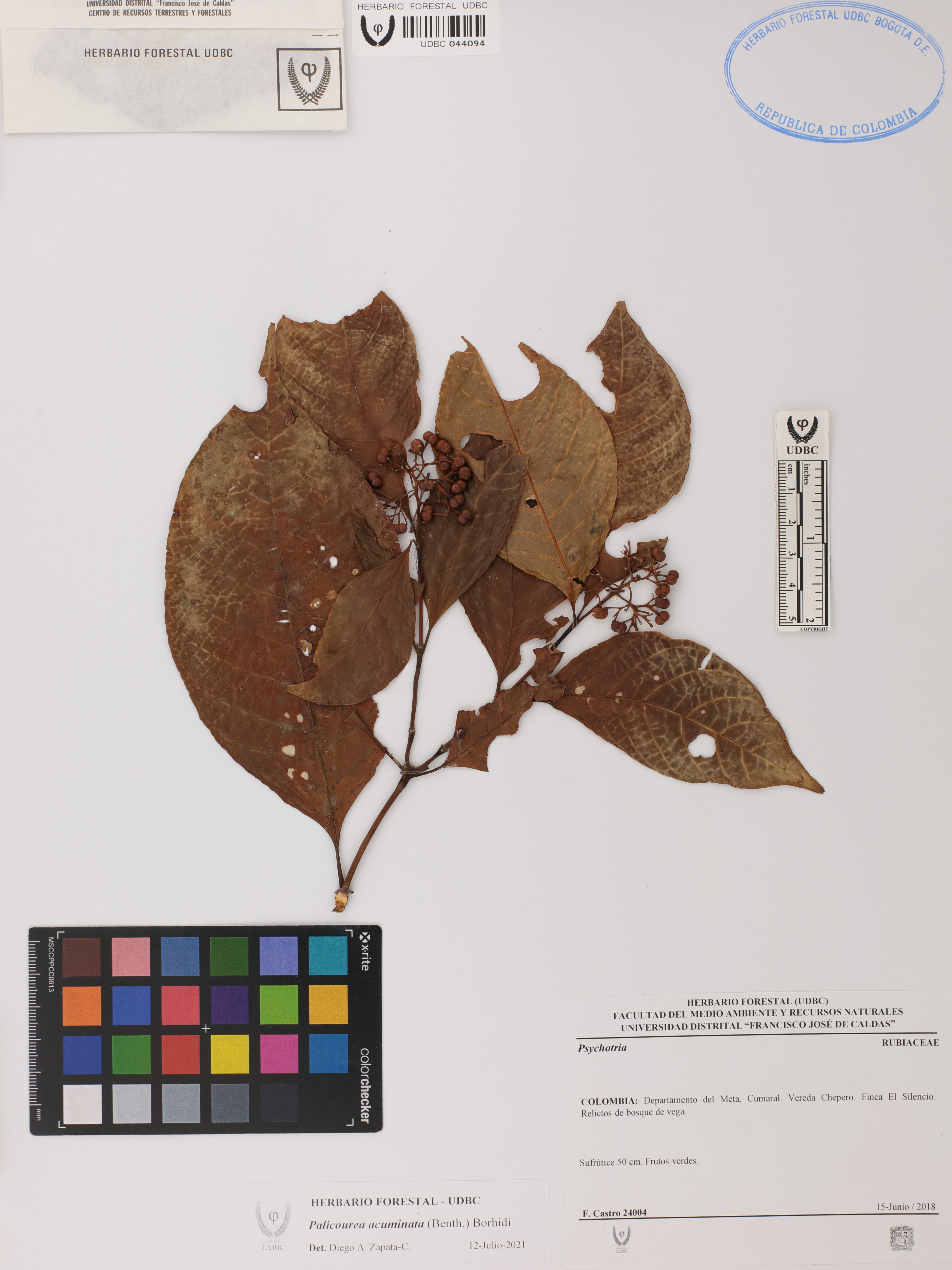 Fotografía del ejemplar Castro, F. 24004, determinado como Palicourea acuminata en el año 2021