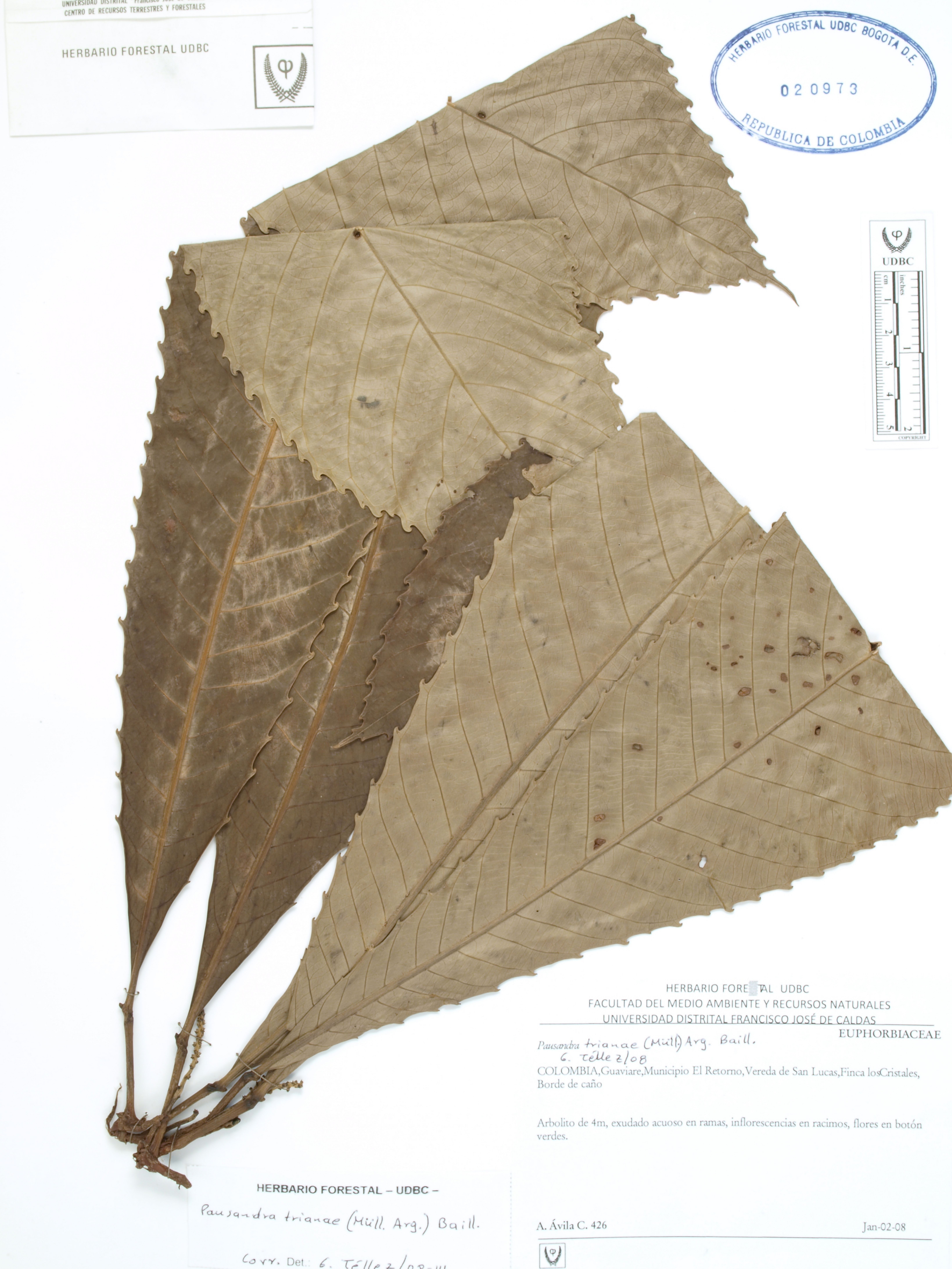 Fotografía del ejemplar Ávila, F. 426, determinado como Pausandra trianae en el año 2008