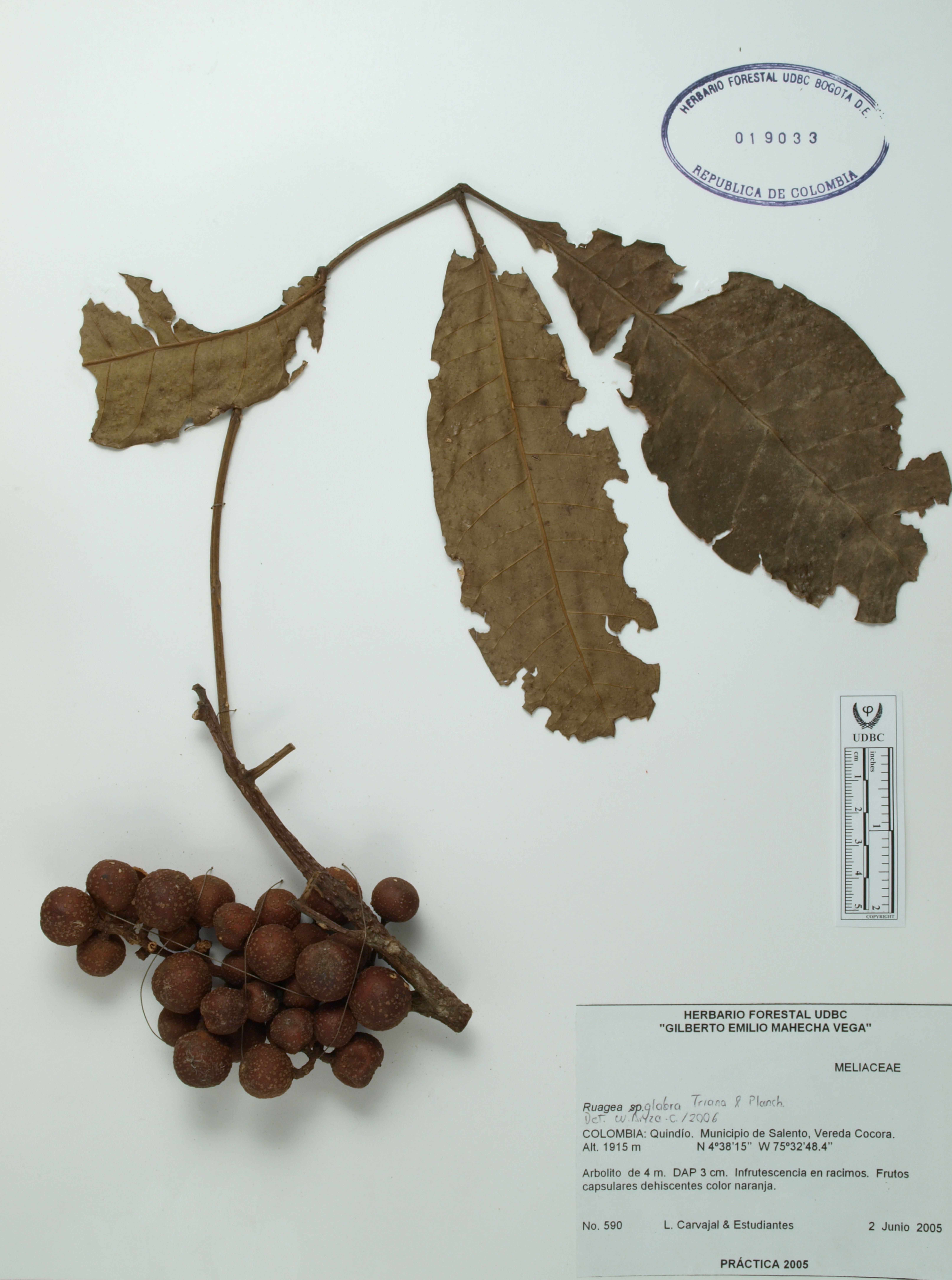 Fotografía del ejemplar Carvajal, L. 590, determinado como Ruagea glabra en el año 2006