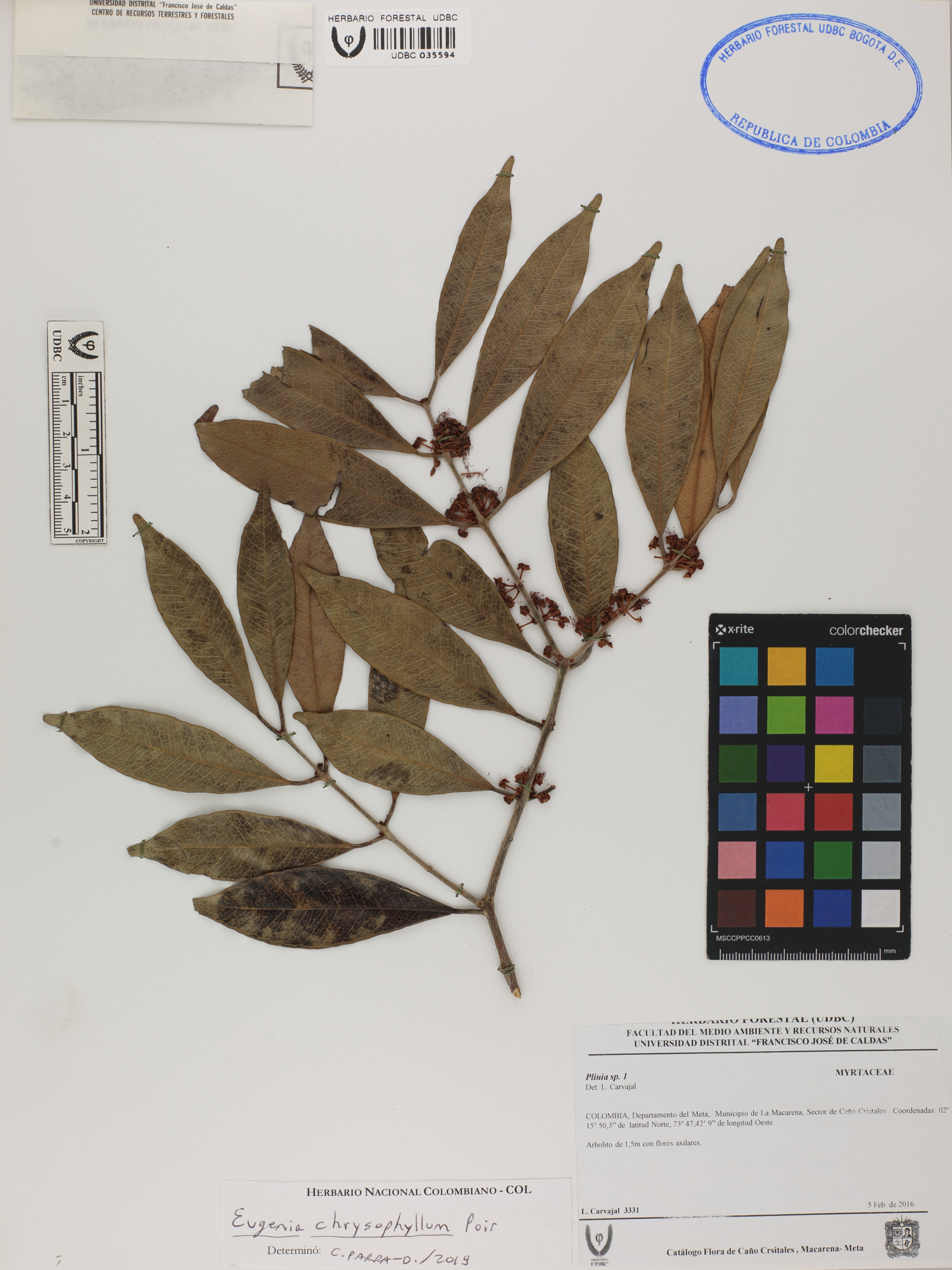 Fotografía del ejemplar Carvajal, L. 3331, determinado como Eugenia chrysophyllum en el año 2019
