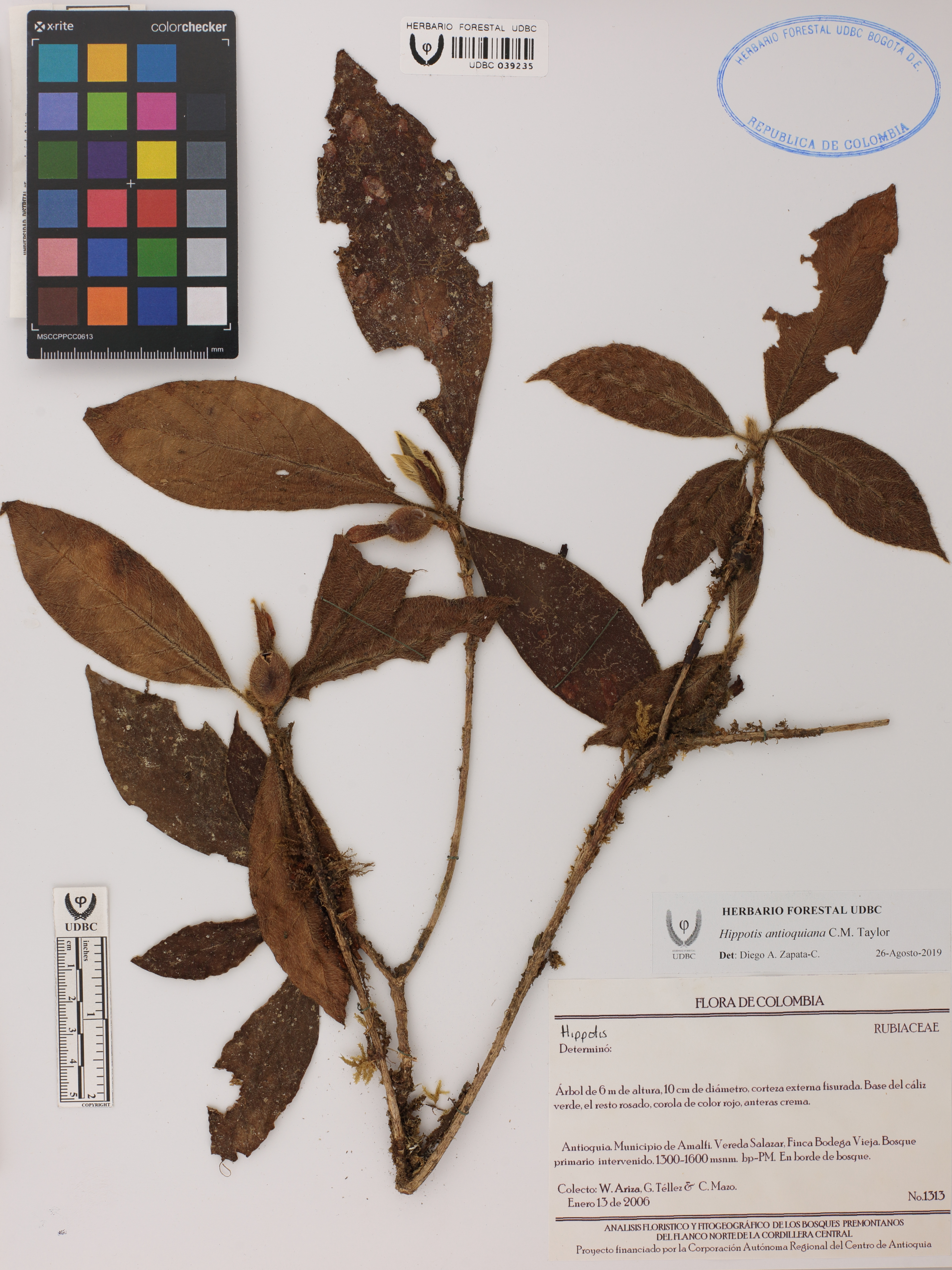 Fotografía del ejemplar Ariza, W. 1313, determinado como Hippotis antioquiana en el año 2019