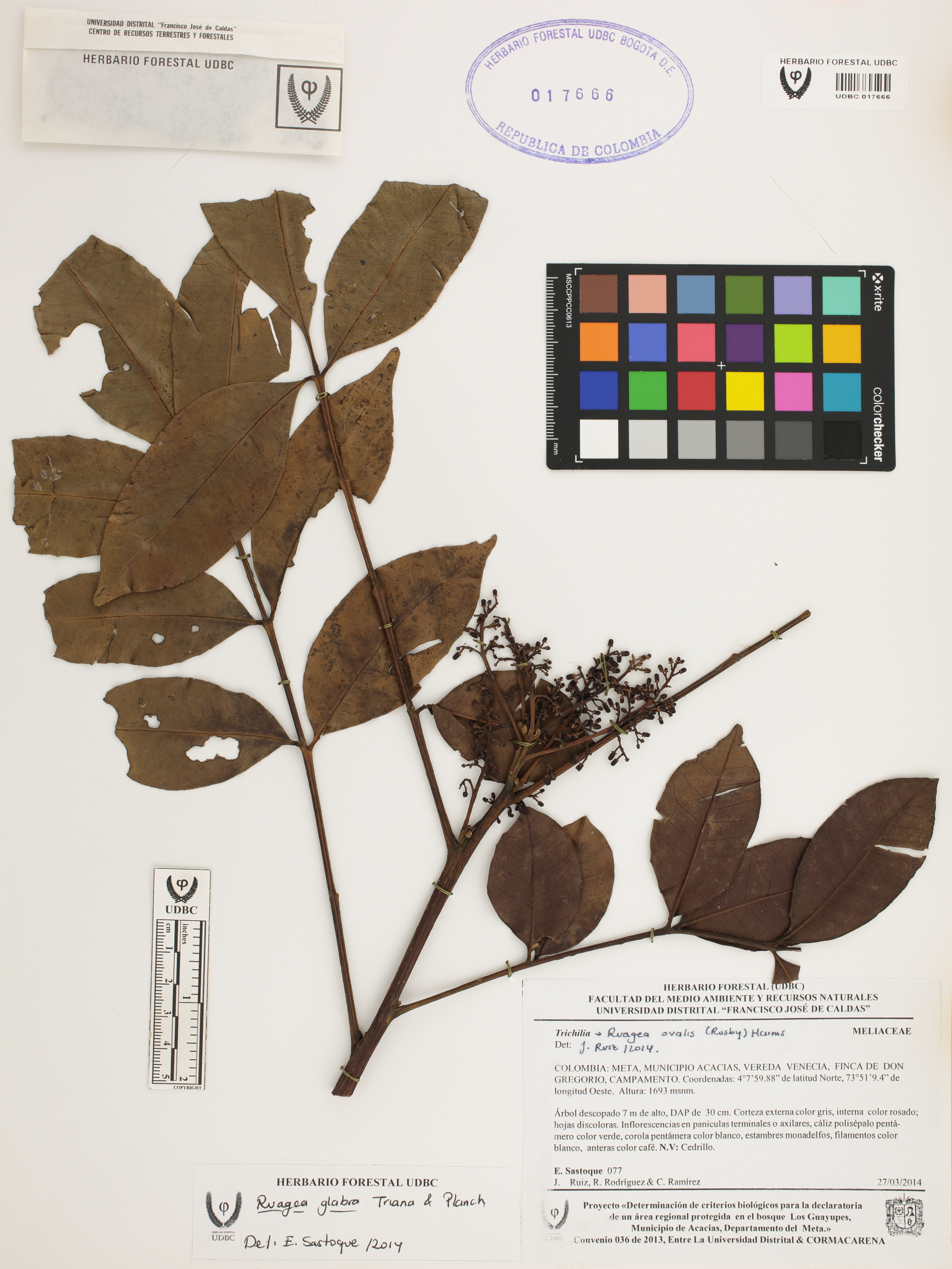 Fotografía del ejemplar Sastoque, E. 77, determinado como Ruagea glabra en el año 2014