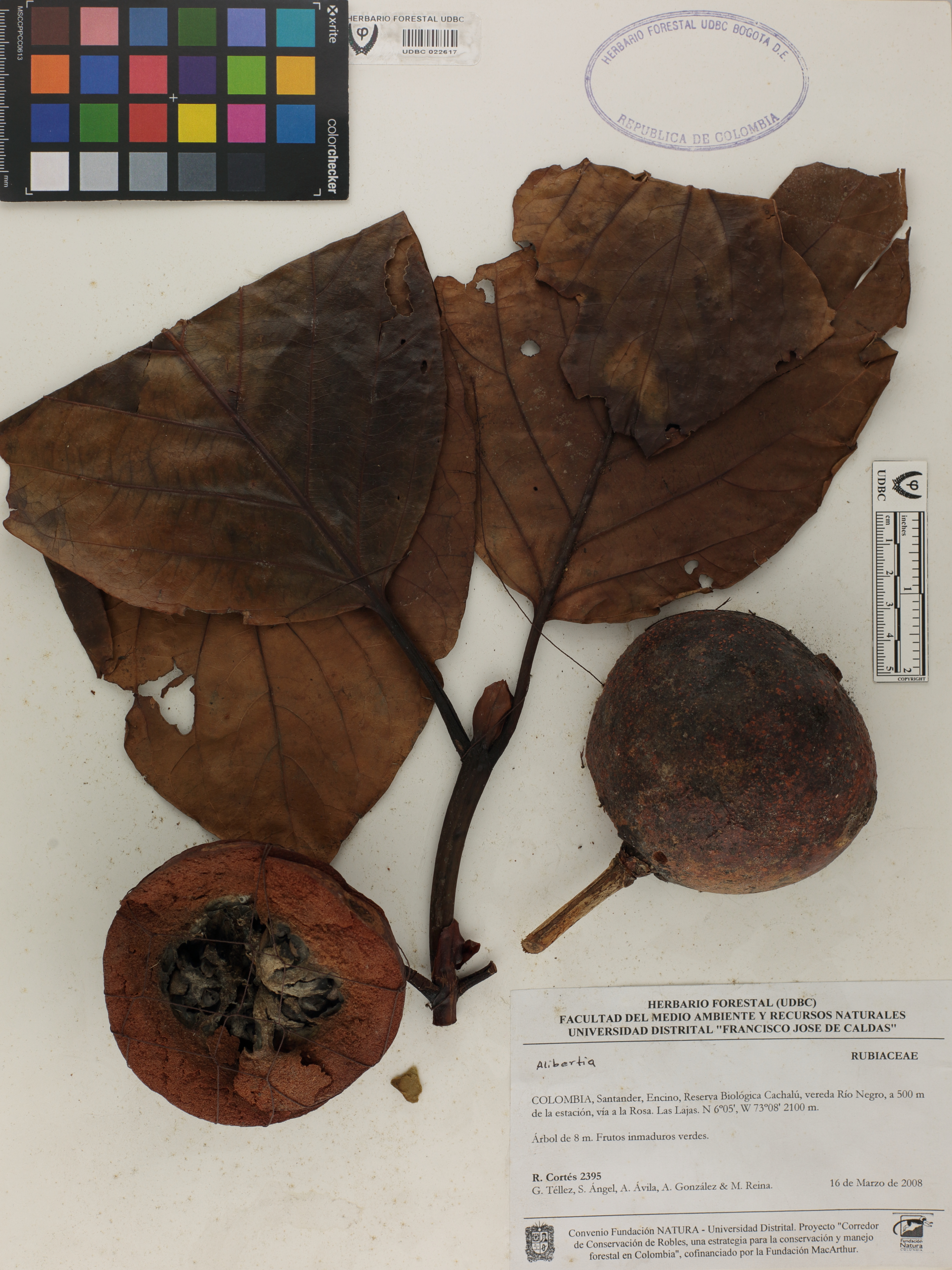 Fotografía del ejemplar Cortés-B., R. 2395, determinado como Alibertia sp.